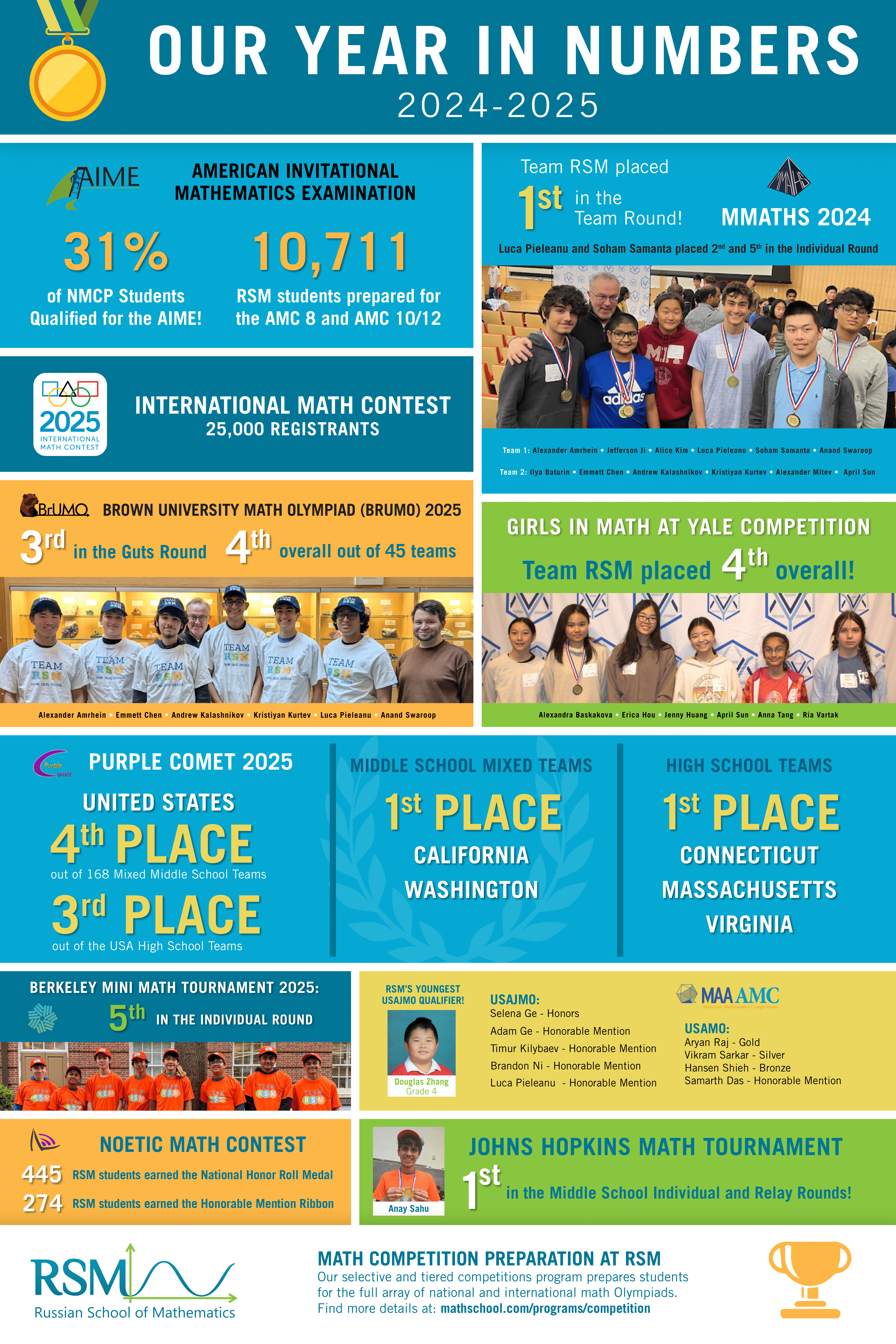 Finally, at Purple Comet! 2025, Team RSM ranked 4th in the United States out of 168 Mixed Middle School Teams and 3rd place out of United States High School Teams. RSM tied for 1st place in California and Washington in the Middle School Mixed Teams. RSM placed 1st in the High School Teams in Connecticut, Massachusetts, and Virgina. The Purple Comet! Math Meet is a team mathematics competition designed for middle and high school students conducted annually since 2003.